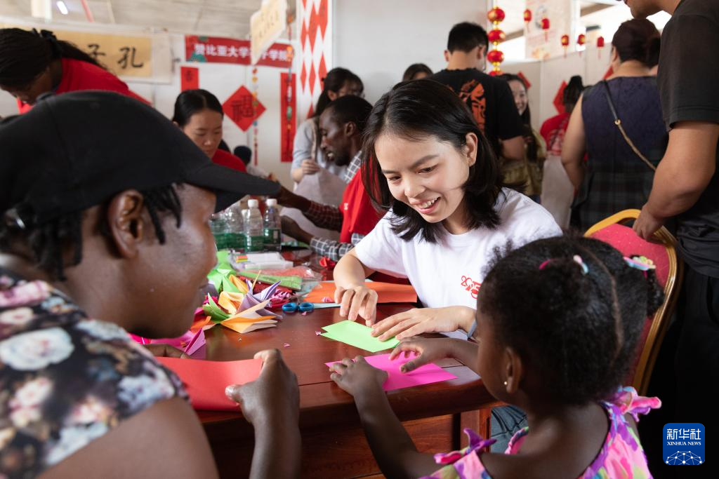 在廟會(huì)現(xiàn)場(chǎng)的贊比亞孔子學(xué)院展位前,人頭攢動(dòng)。包括書法體驗(yàn)、剪紙、折紙展示和猜字謎等豐富的文化互動(dòng)項(xiàng)目,吸引人們紛紛參與體驗(yàn)。一位贊比亞媽媽帶著孩子在老師指導(dǎo)下完成她的第一個(gè)中國(guó)結(jié)作品,她高興地說(shuō):“原來(lái)中國(guó)藝術(shù)這么有趣!希望我的孩子有一天可以去孔子學(xué)院學(xué)習(xí)。”