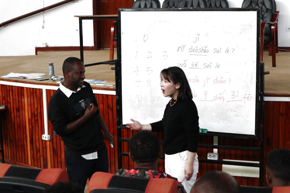 2024年12月2日,在埃塞俄比亞亞的斯亞貝巴大學(xué),孔子學(xué)院老師宋瑞榮(右)在教室與學(xué)生互動(dòng)。新華社記者 劉方強(qiáng) 攝
