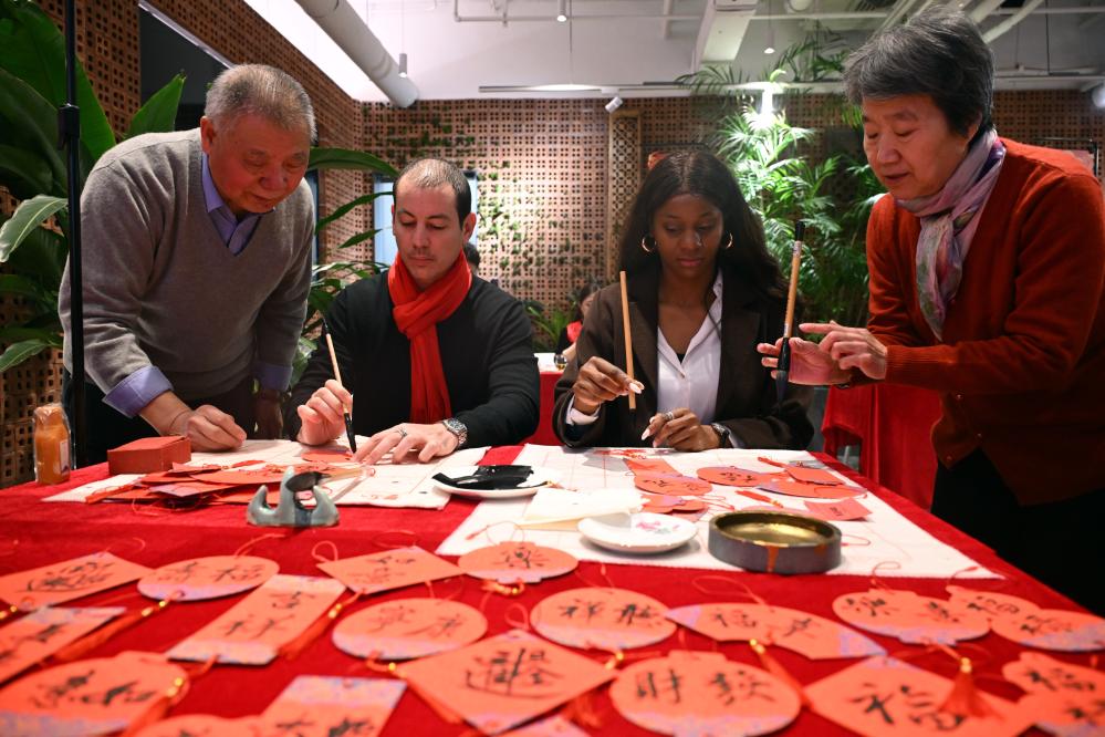 1月17日,外國(guó)人在大聯(lián)歡活動(dòng)中體驗(yàn)書法。當(dāng)日,“春暖朝陽(yáng)·巳巳如意”中外居民大聯(lián)歡新時(shí)代文明實(shí)踐活動(dòng)在北京朝陽(yáng)區(qū)左家莊街道舉行。新華社記者 金良快 攝