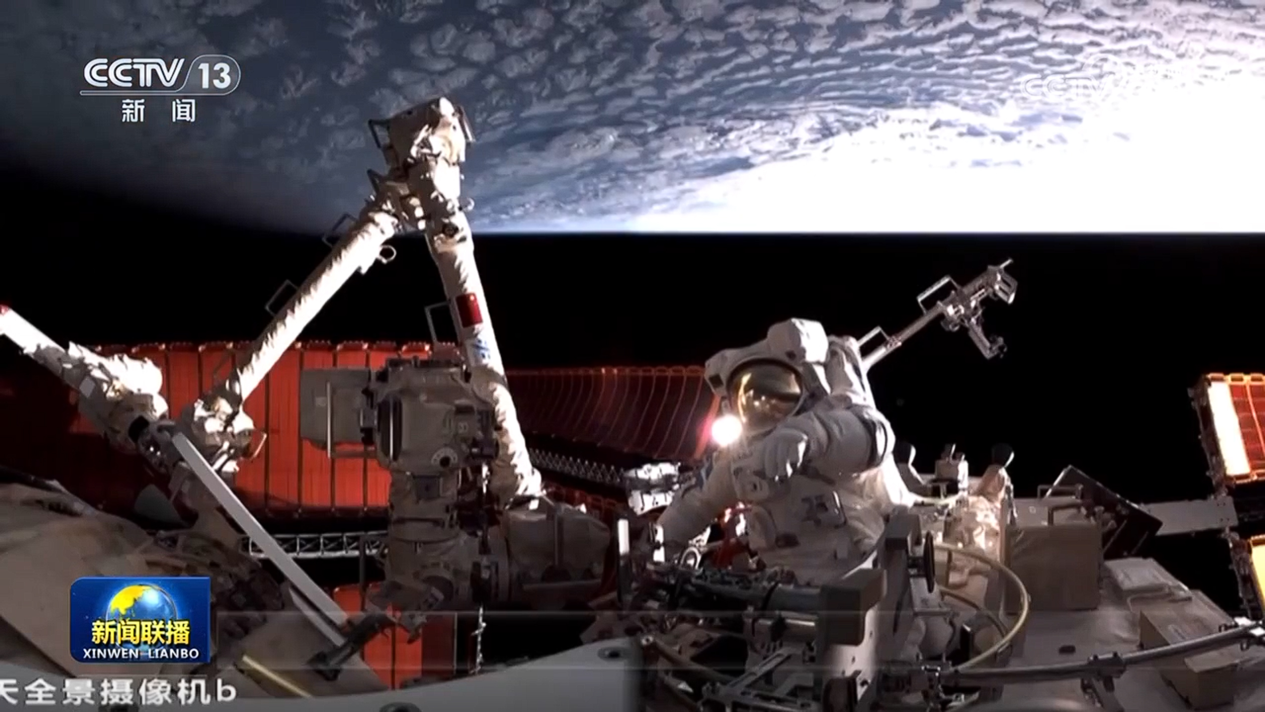 20日16時(shí)55分,航天員宋令東打開問天實(shí)驗(yàn)艙出艙艙門,首先出艙,登上機(jī)械臂。