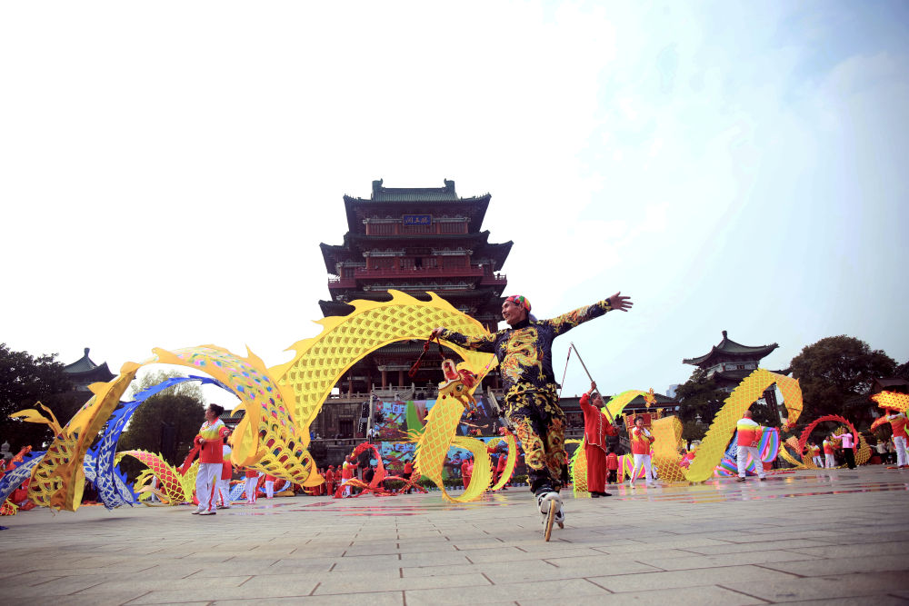 圖為滕王閣下,熊福根踩著輪滑舞彩帶龍。
