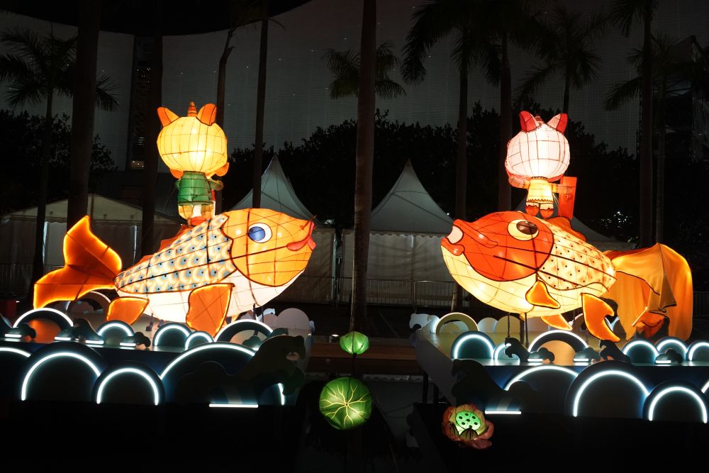香港文化中心露天廣場上,一組由香港非物質(zhì)文化遺產(chǎn)辦事處策劃的扎作彩燈與四周景色相映成趣,錦鯉與金魚在水池上躍動(dòng),小醒獅站在魚背上嬉戲。