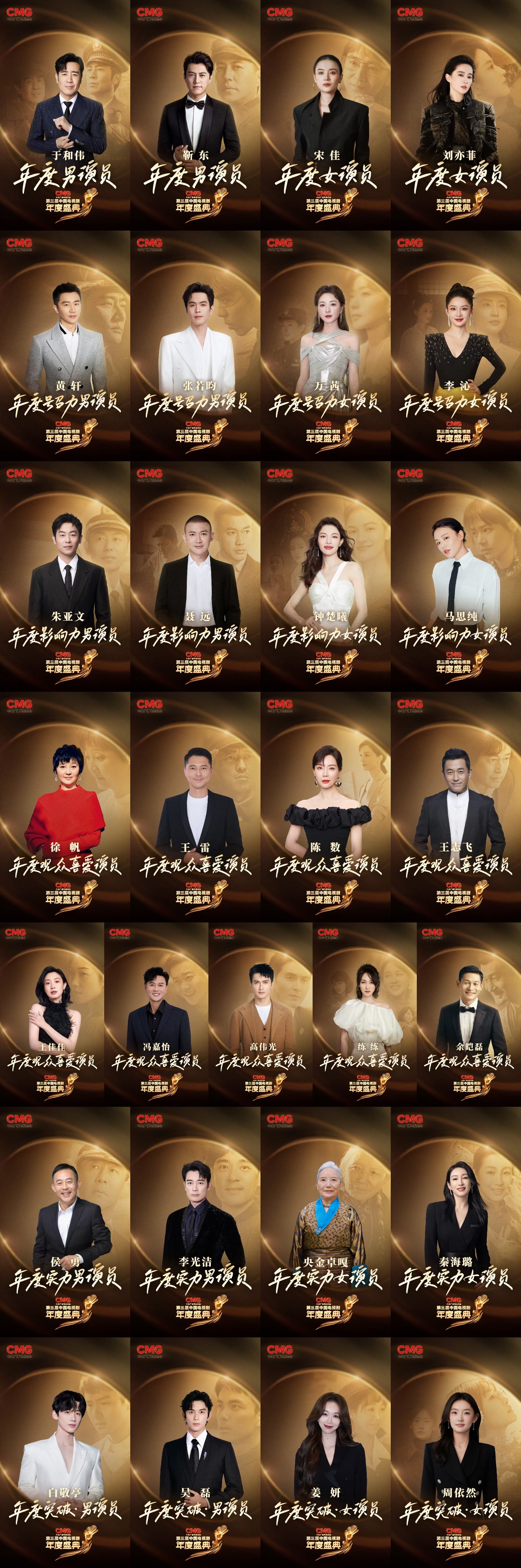 憑借深入人心的熒屏形象,演員于和偉、靳東,宋佳、劉亦菲贏得了觀眾和行業(yè)的高度認(rèn)可,分別獲得“年度男演員”“年度女演員”榮譽(yù);頗具“觀眾緣”的黃軒、張若昀,萬茜、李沁,分別獲得“年度號召力男演員”“年度號召力女演員”榮譽(yù);朱亞文、聶遠(yuǎn),鐘楚曦、馬思純以細(xì)膩的人物刻畫喚起觀眾的廣泛共鳴,分別獲得“年度影響力男演員” “年度影響力女演員”榮譽(yù);塑造出生動鮮活角色形象的徐帆、王雷、陳數(shù)、王志飛、王佳佳、馮嘉怡、高偉光、練練、余皚磊,獲得“年度觀眾喜愛演員”榮譽(yù);侯勇、李光潔,央金卓嘎、秦海璐以不著痕跡、潤物無聲的表演,分別獲得“年度實(shí)力男演員”“年度實(shí)力女演員”榮譽(yù);不斷探索表演邊界的白敬亭、吳磊,姜妍、周依然,分別獲得“年度突破·男演員”“年度突破·女演員”榮譽(yù)。
