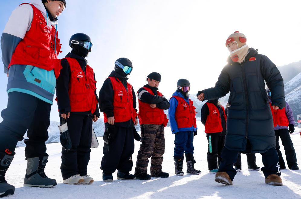 在新疆白云國際滑雪場(chǎng),許秀娟(右一)在為新聘的雪場(chǎng)教練做培訓(xùn)。新華社記者 王菲 攝
