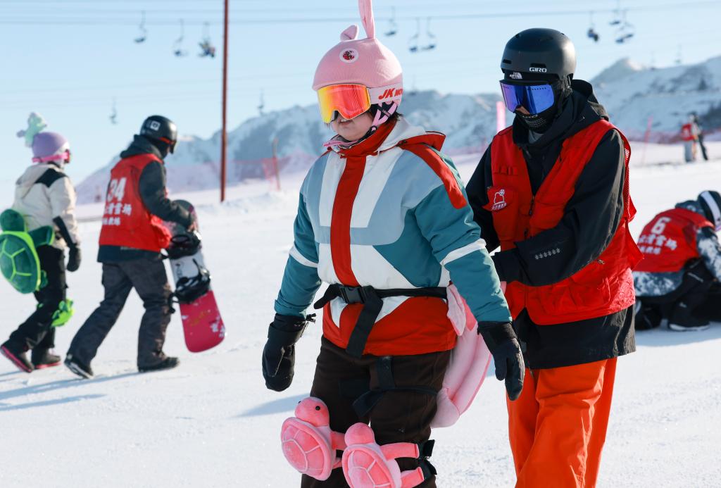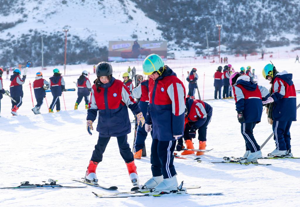 2024年12月25日,在位于烏魯木齊縣的新疆白云國際滑雪場(chǎng),烏魯木齊縣永豐中學(xué)的學(xué)生在上滑雪課。新華社記者 王菲 攝