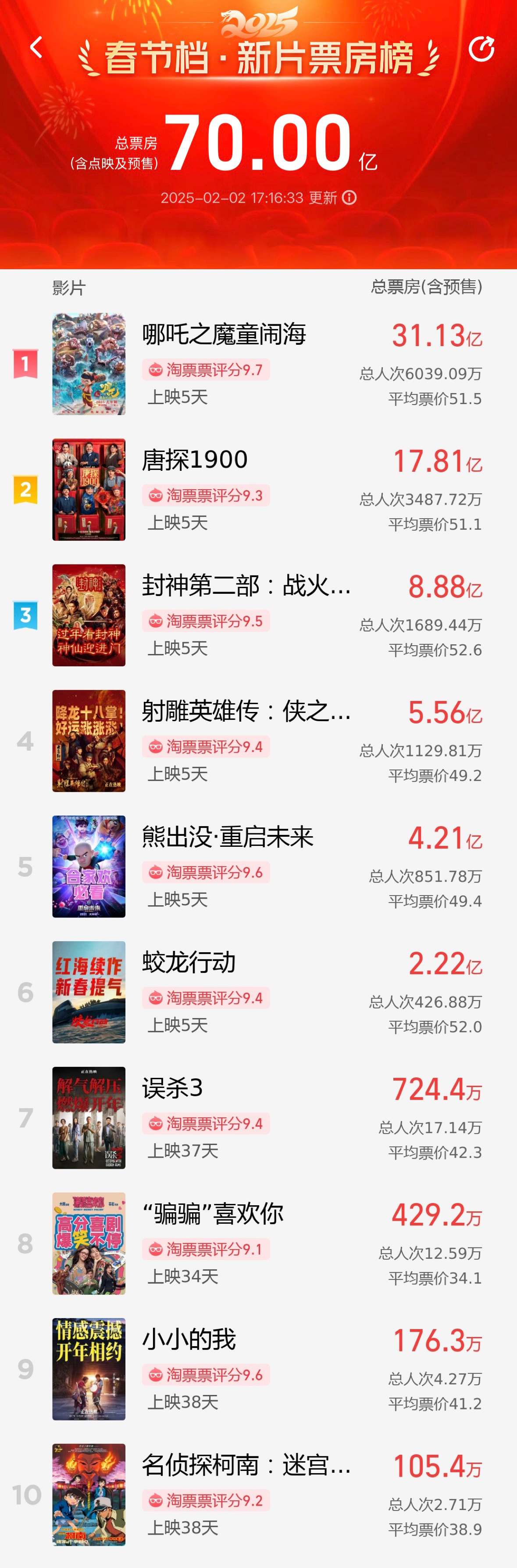 其中,《哪吒之魔童鬧?!菲狈客黄?0億