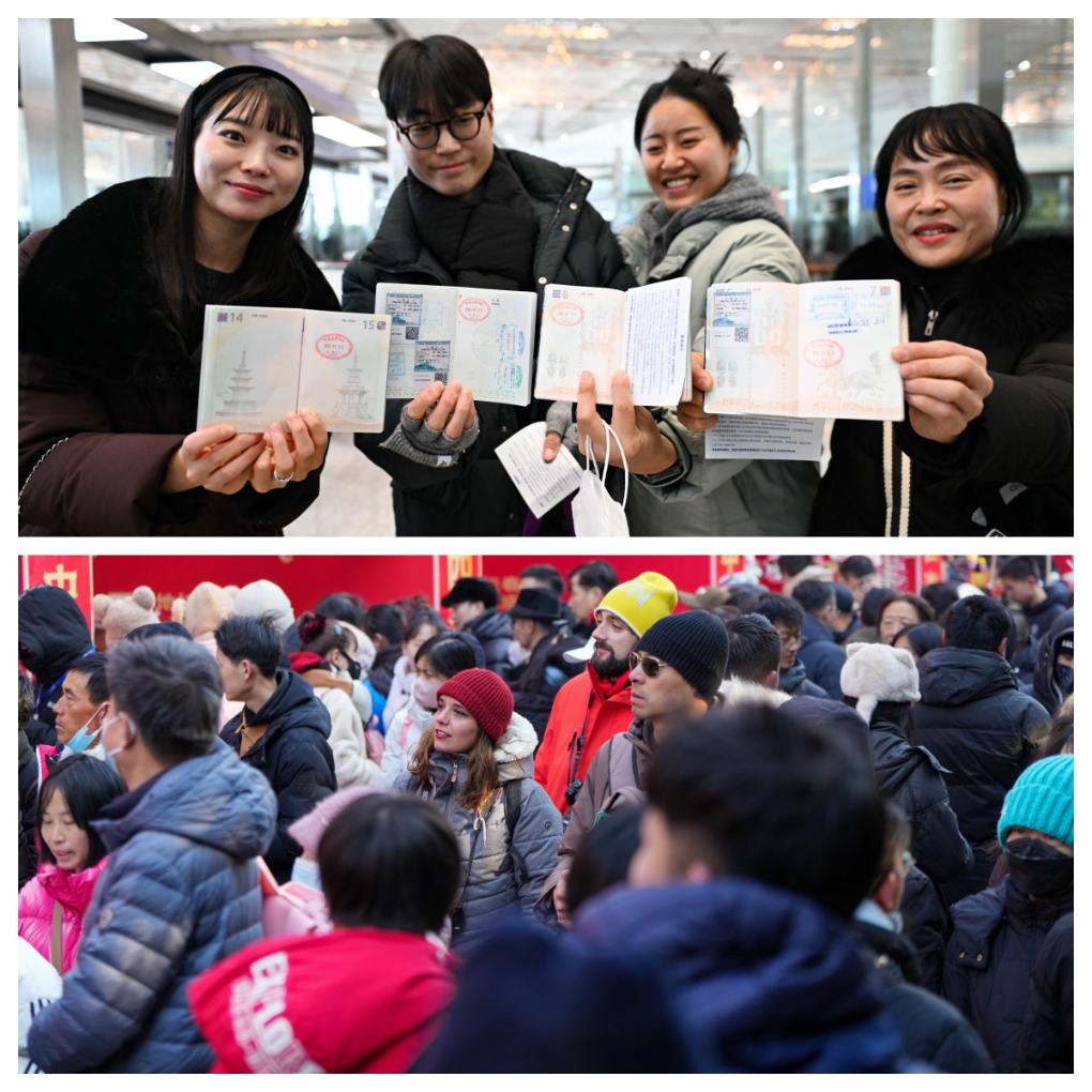 拼圖:(上圖)1月28日,在首都國際機(jī)場,四名韓國游客利用免簽政策來中國旅游,他們向記者展示著護(hù)照上的入境章。(下圖)1月29日,兩位來自西班牙的游客在北京地壇廟會游覽。