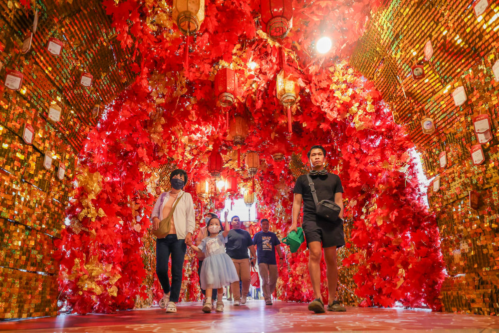 1月27日,在菲律賓馬尼拉,人們穿過掛滿春節(jié)裝飾的走廊。新華社發(fā)(烏馬利攝)
