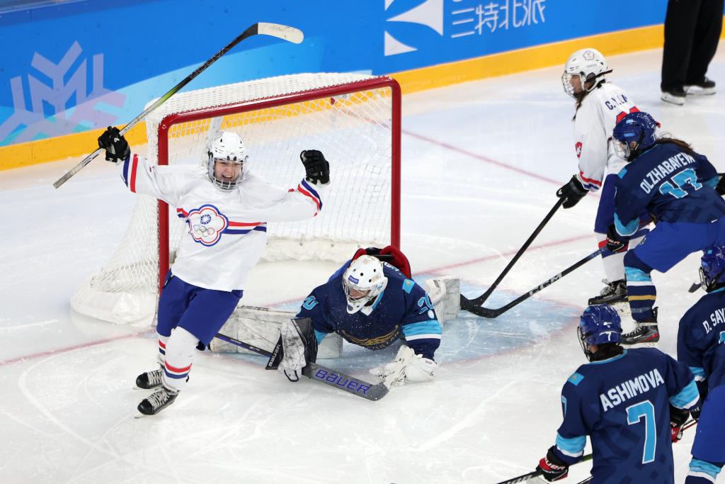 這里正在上演女子冰球B組一場焦點戰(zhàn),對陣雙方是中國臺北隊與哈薩克斯坦隊,比賽開場第五分鐘,中國臺北隊就打入一球,進球的68號球員雙臂高高舉起,和隊友一起慶祝,觀眾席傳來的,是山呼海嘯般的歡呼聲。