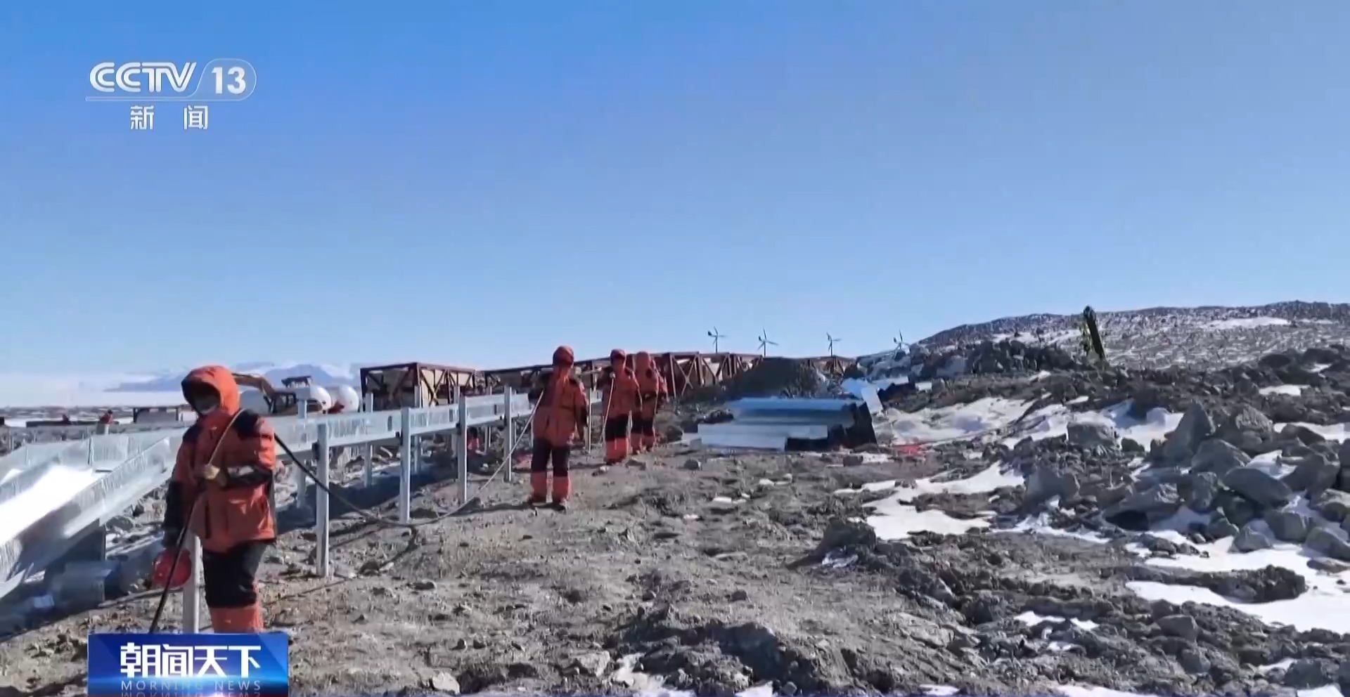 中國第41次南極考察隊秦嶺站站長 王哲超:我身后就是秦嶺站新能源體系中的風(fēng)力發(fā)電和光伏發(fā)電。目前我們已經(jīng)完成了10個風(fēng)機(jī)的安裝,現(xiàn)在正在安裝的是光伏支架還有光伏板。