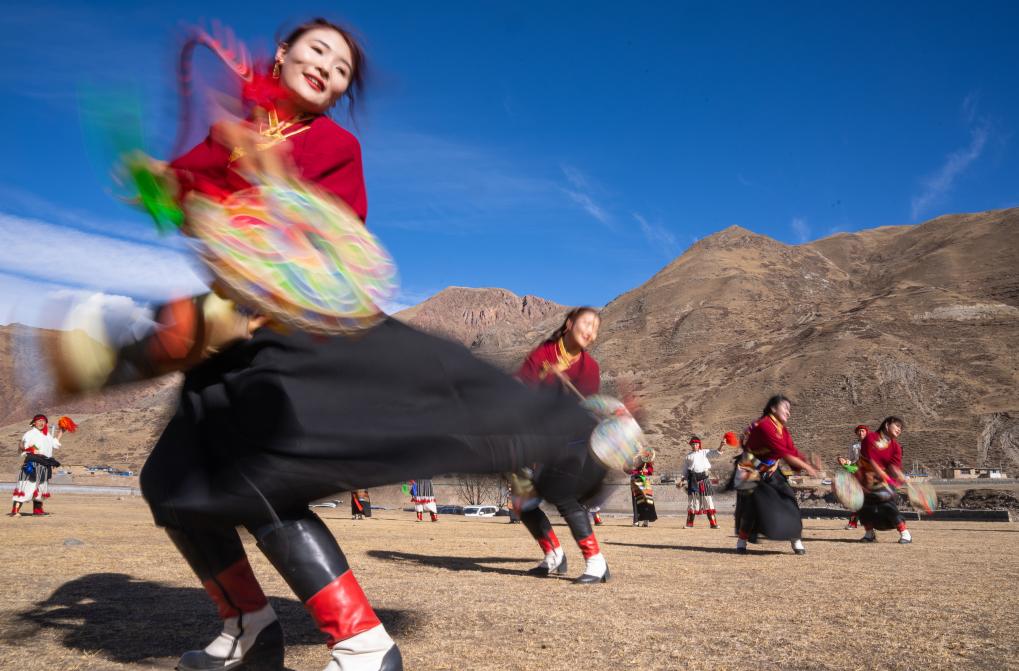 西藏昌都市丁青縣尺犢鎮(zhèn)烏巴村文藝演出隊在跳熱巴舞(1月5日攝)。新華社記者 丁增尼達 攝