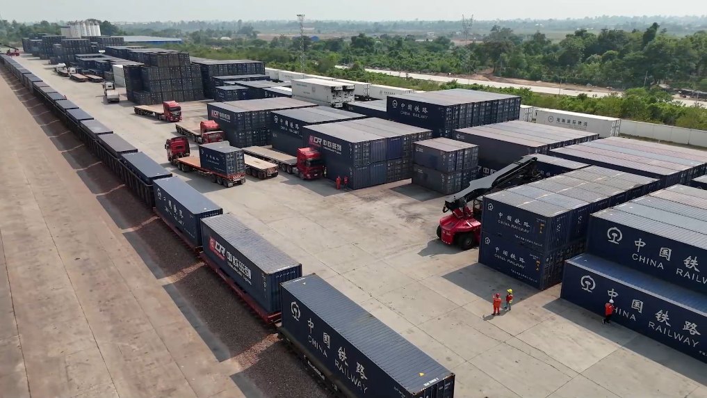 在中老鐵路萬象南站換裝場(chǎng),一派繁忙而有序的景象映入眼簾。滿載泰國榴蓮、龍眼等貨物的集裝箱被穩(wěn)穩(wěn)吊裝上開往中國的中老鐵路“瀾湄快線”列車,裝有中國啤酒、藥膏等貨物的集裝箱則啟程前往泰國。