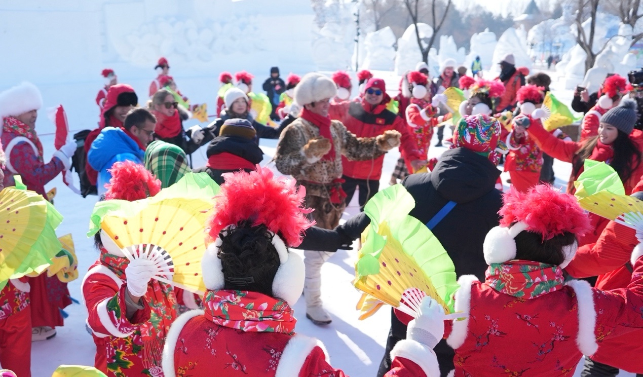 各國(guó)來(lái)賓與哈爾濱民間秧歌隊(duì)一同載歌載舞