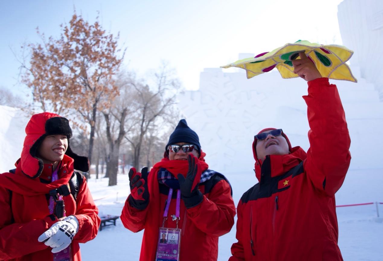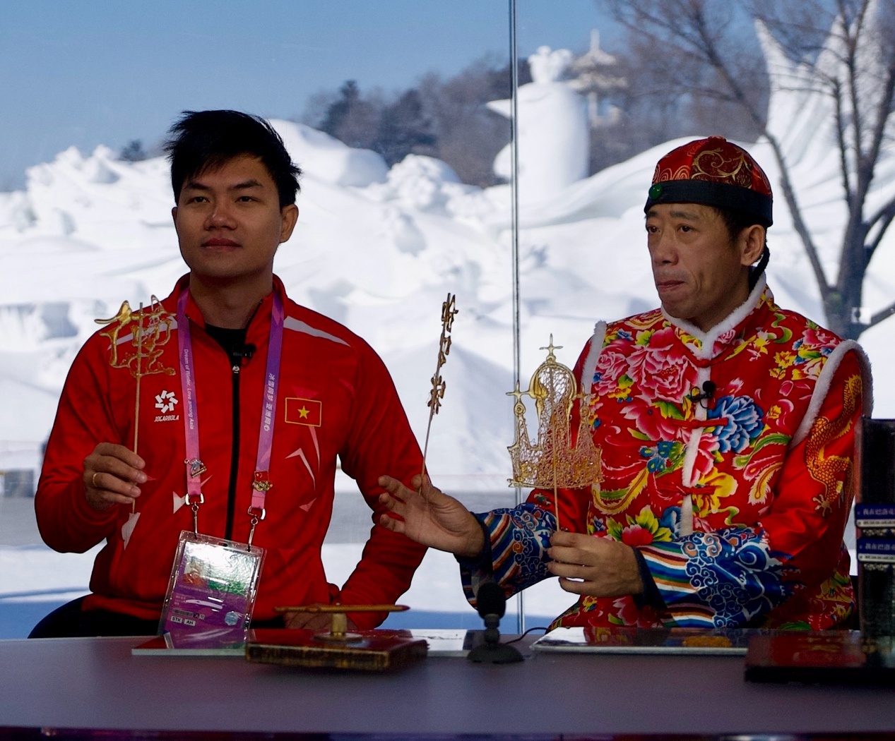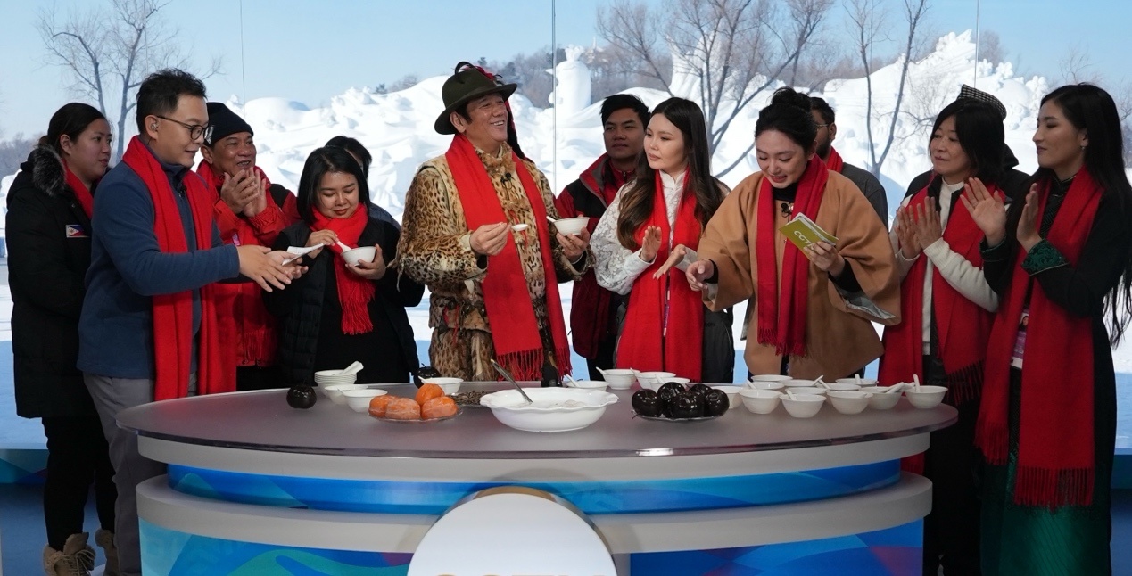 來(lái)自蒙古國(guó)、泰國(guó)、菲律賓、越南、印度、尼泊爾等國(guó)的近20位運(yùn)動(dòng)員、體育代表團(tuán)官員和媒體人,在賽場(chǎng)上比拼之后,歡聚在哈爾濱太陽(yáng)島雪博會(huì)中央廣播電視總臺(tái)的演播室,在冰天雪地中共慶新春。