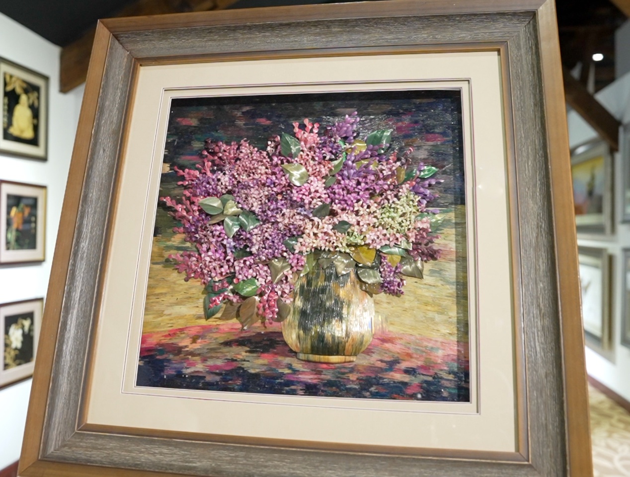 麥秸畫(huà)是以生長(zhǎng)在東北黑土地上的麥稈為原料,利用其自然光澤、紋理和質(zhì)感,經(jīng)過(guò)選料、泡、煮、染、刮等十幾道手工制作工序,將花卉、風(fēng)景、建筑、人物、動(dòng)物等生動(dòng)形象地表現(xiàn)出來(lái)。