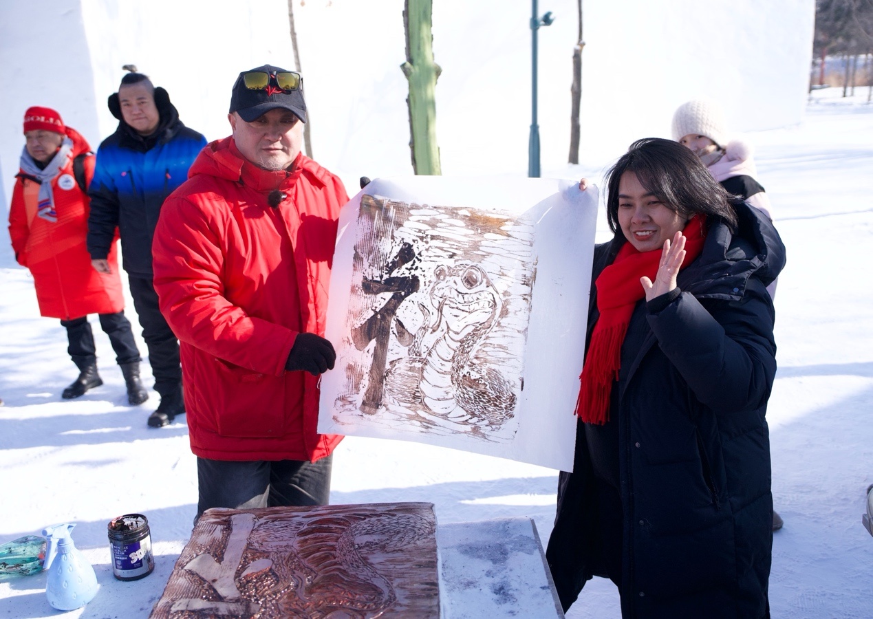 泰國(guó)駐華大使館二等秘書(shū)王安安在黑龍江省藝術(shù)研究院冰版畫(huà)研究院副院長(zhǎng)盛琰的指導(dǎo)下,制作出冰版畫(huà)《畫(huà)蛇添福》,用蛇的形狀和漢字的偏旁部首組合雕刻出漢字“?!辈⑼赜〕鰜?lái),寄托對(duì)中國(guó)農(nóng)歷蛇年的祝福。