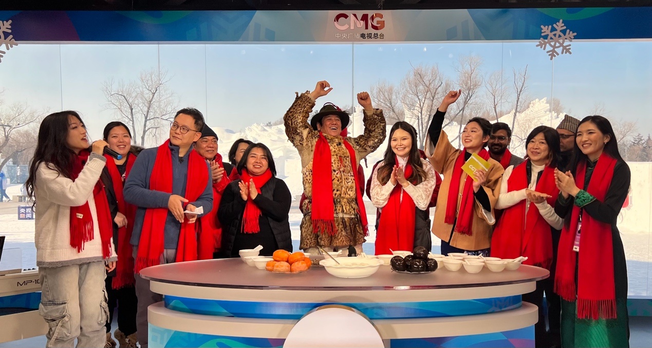 參加“當(dāng)亞冬會(huì)遇上‘非遺年’”人文交流活動(dòng)的中外嘉賓在哈爾濱太陽(yáng)島雪博會(huì)CMG演播室同慶新春
