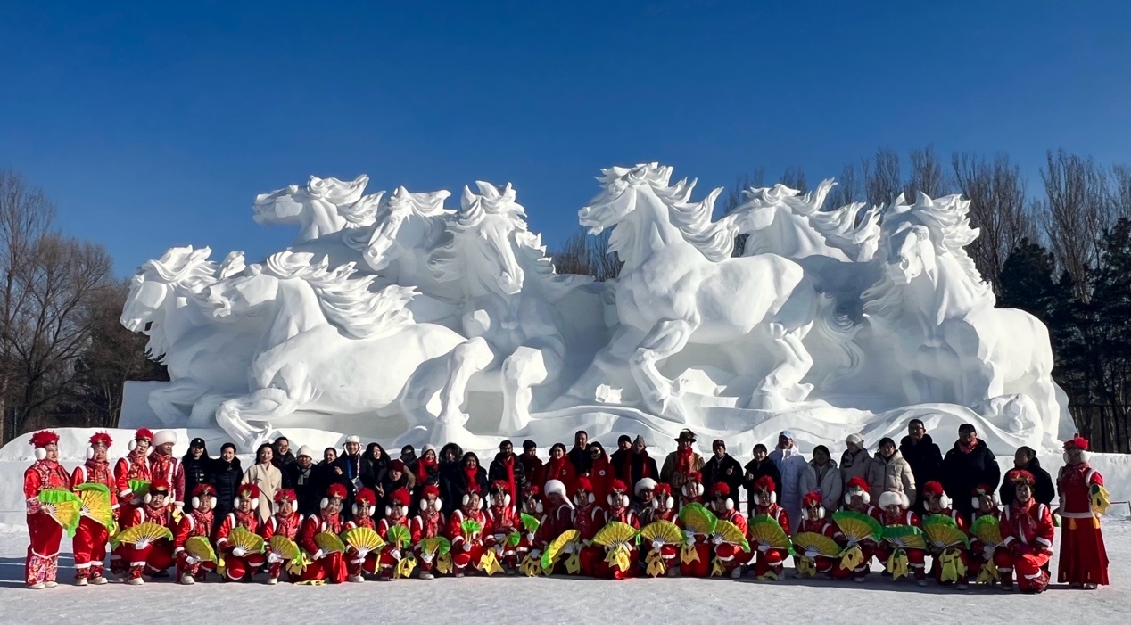 參加活動(dòng)的中外友人在雪博會(huì)雪雕作品《八駿踏雪》前合影