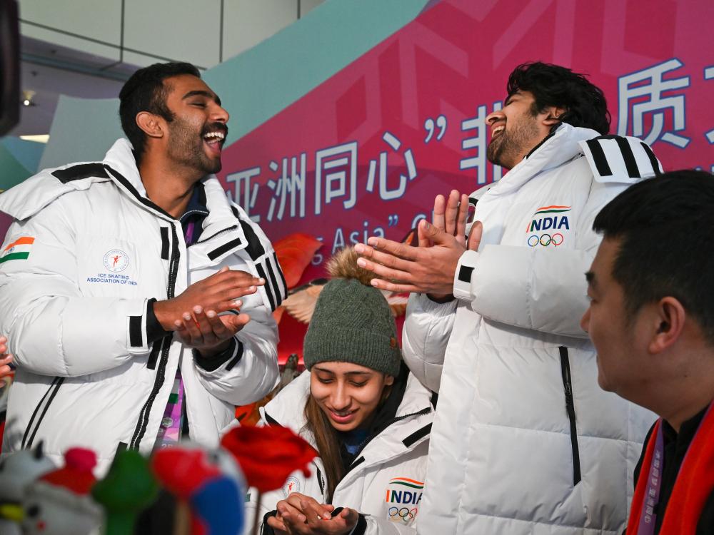 ↑印度代表團(tuán)速度滑冰運動員在體驗面塑制作。新華社記者 王曦 攝