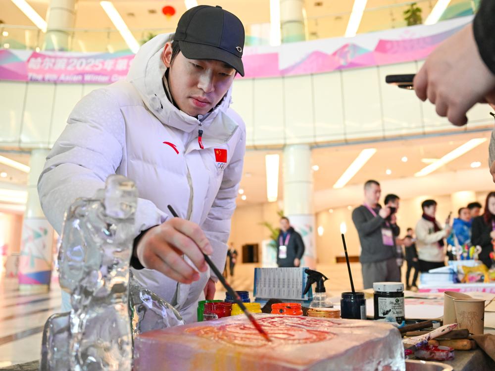 ↑在第九屆亞冬會運動員村,中國代表團(tuán)的冰球運動員張澤森在體驗拓彩冰雪畫。新華社記者 王曦 攝