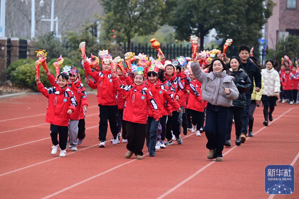 2月14日,合肥市園上園小學(xué)喻崗分校師生在開學(xué)典禮上進行“貪吃蛇”接力跑活動。新華社記者 周牧 攝