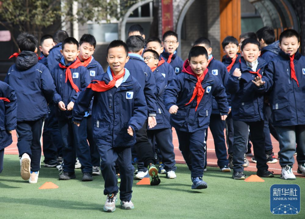 2月14日,西安市后宰門小學(xué)學(xué)生在體育課上進行熱身活動。新華社記者 張博文 攝