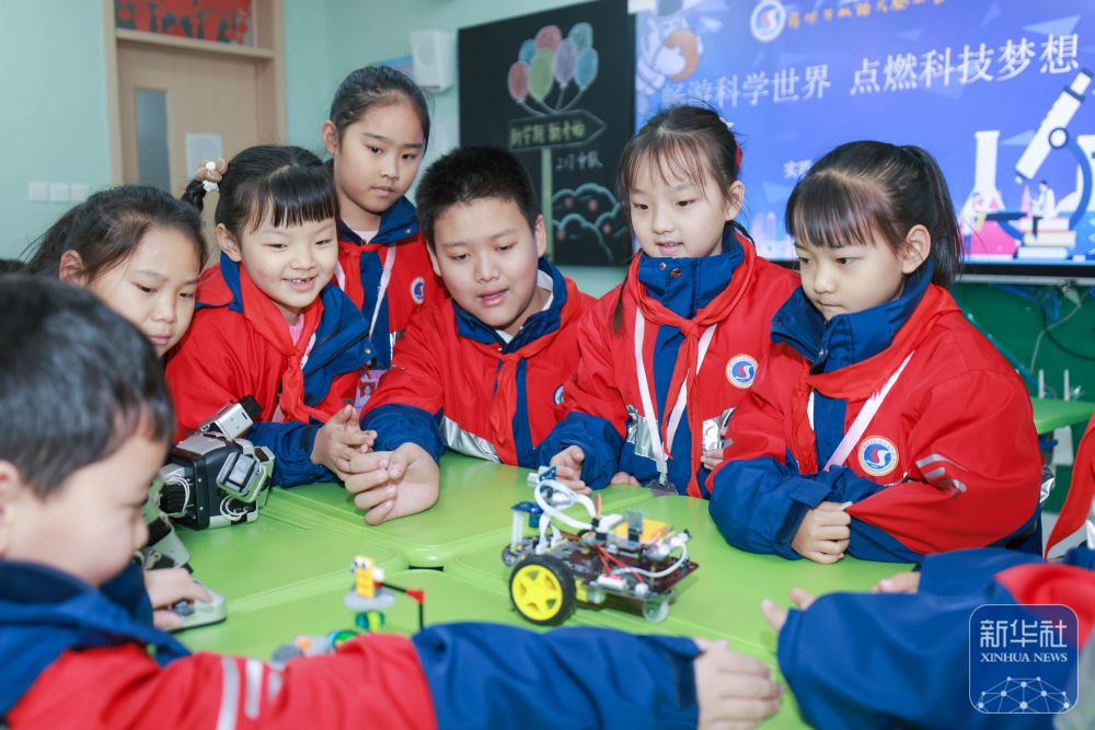 2月14日,在山東省棗莊市薛城區(qū)雙語實驗小學(xué),學(xué)生們與編程機器人互動。新華社發(fā)(王龍飛攝)