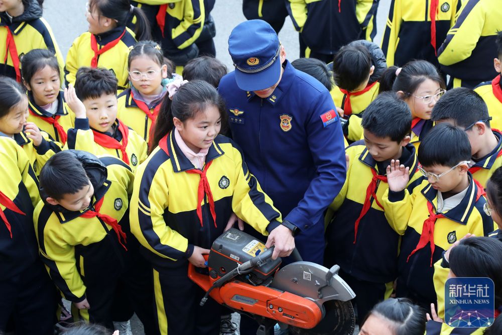 2月14日,在山東省臨沂市郯城縣北城實驗小學(xué),消防救援人員為小學(xué)生講解消防裝備器材。新華社發(fā)(張春雷攝)