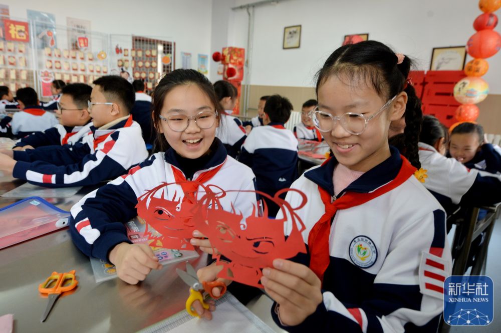 2月14日,兩名學(xué)生在山東青島宜陽路小學(xué)“傳統(tǒng)文化潤童心”主題活動中學(xué)習(xí)“哪吒”剪紙。新華社發(fā)(王海濱攝)