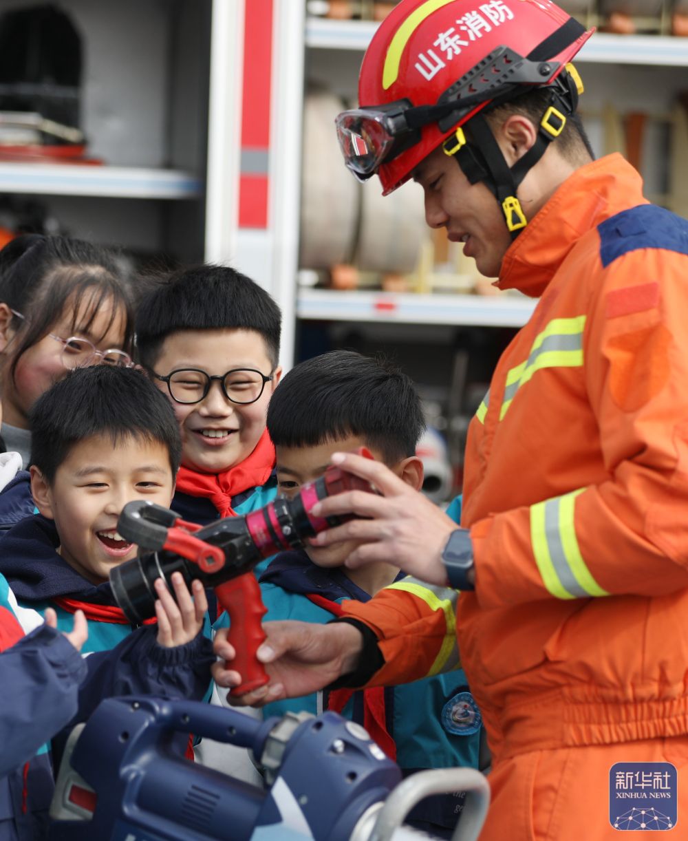 2月14日,在山東省棗莊市市中區(qū)東湖小學(xué),消防員帶領(lǐng)學(xué)生們近距離觸摸消防器材。新華社發(fā)(王海楠攝)