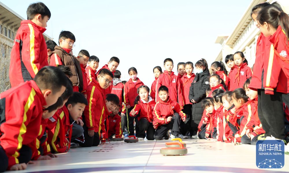 2月14日,河北省滄州市東光縣第三實驗小學(xué)的學(xué)生們在課間參加陸地冰壺活動。新華社發(fā)(周洋攝)