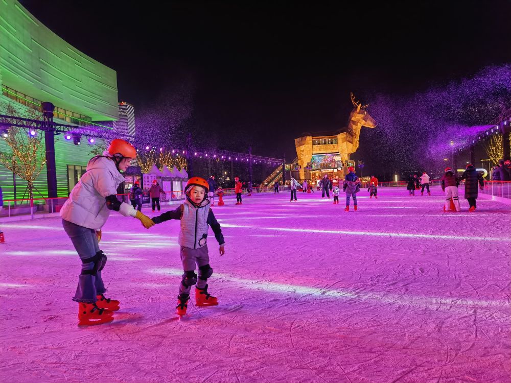 在上海徐匯濱江,“樂滑之夢”和西岸夢中心聯(lián)手打造的戶外水岸冰場熱鬧非凡。伴隨節(jié)奏感強(qiáng)的音樂和靈動(dòng)燈光,上海市民周雄和兒子手牽手,在冰面上練習(xí)滑行。