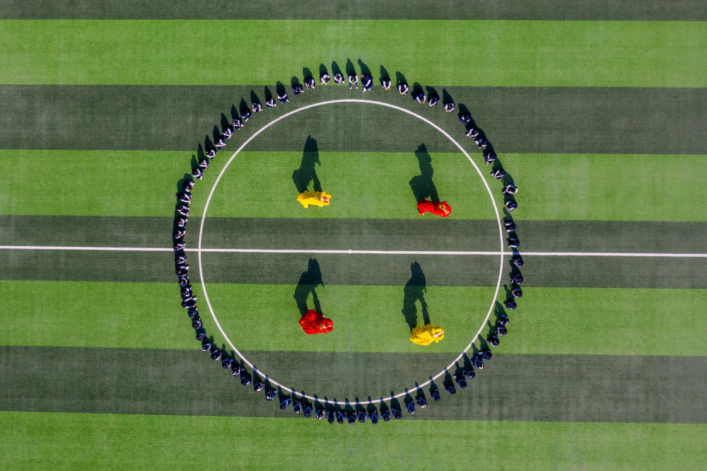 2月14日,山東省淄博科技學(xué)校龍獅社團的學(xué)生在操場上進行舞獅演練(無人機照片)。新華社發(fā)(張維堂攝)