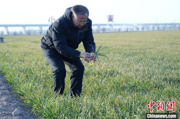 2月16日,茹振鋼在麥田里察看苗情。 中新社記者 闞力 攝