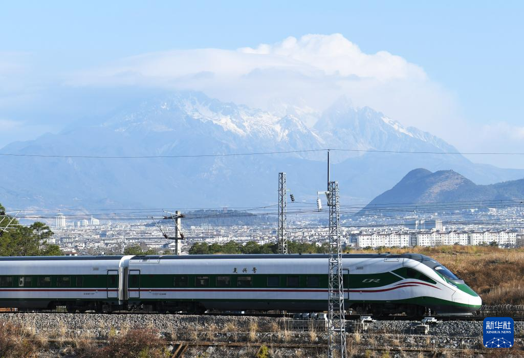 圖為2月22日,一列動車組列車行駛在云南麗江玉龍雪山腳下的麗香鐵路線上。