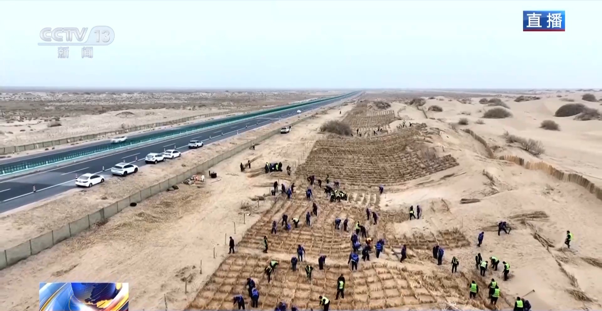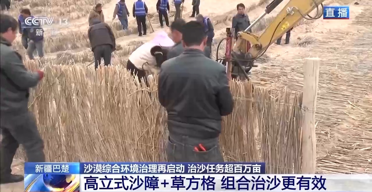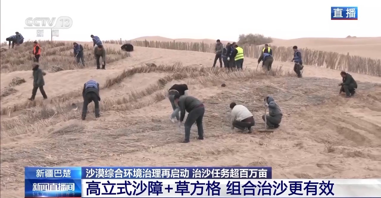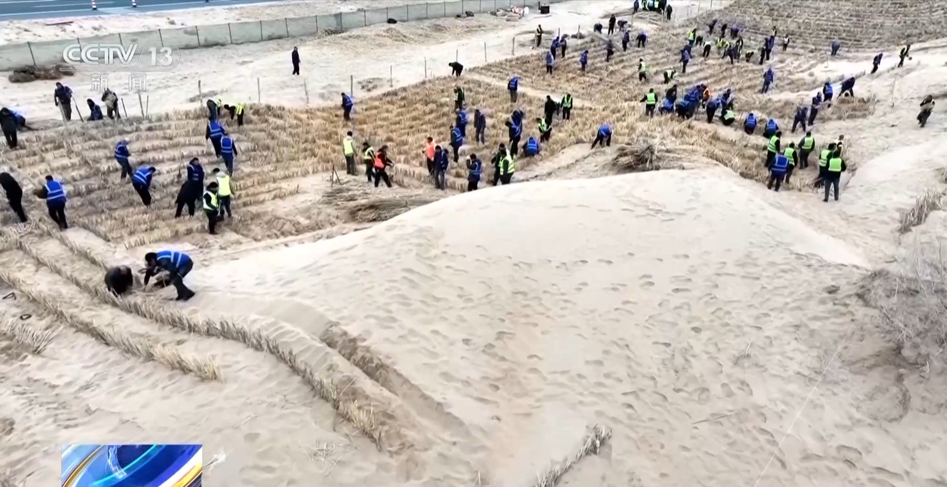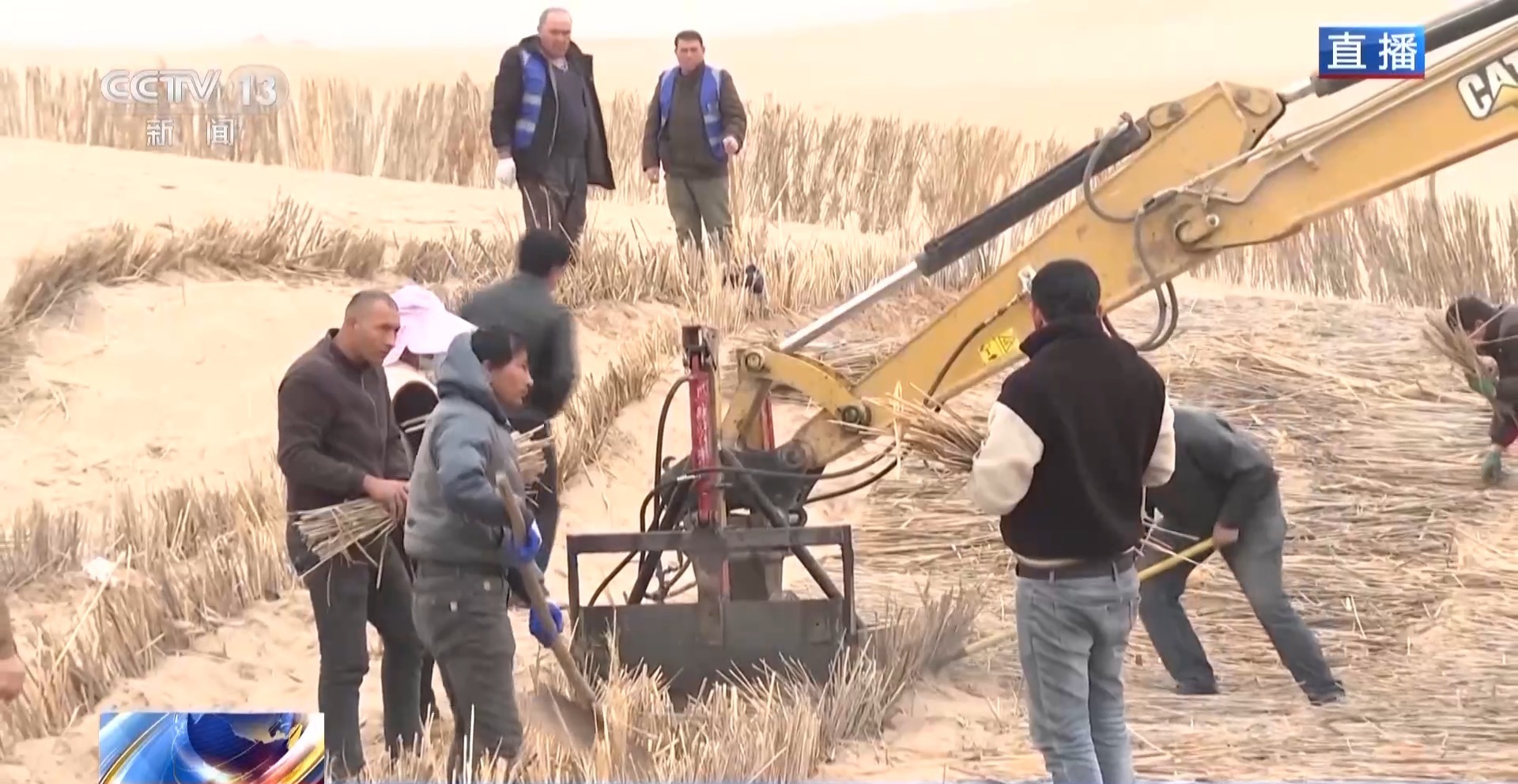 總臺記者從新疆巴楚縣阿克薩克馬熱勒鄉(xiāng)防沙治沙工程施工現(xiàn)場發(fā)回報道。當?shù)氐?00多名各族干部群眾人工鋪設(shè)“草方格”,也就是將干蘆葦鋪設(shè)在地面,再壓進沙土中,它的主要作用是固沙。