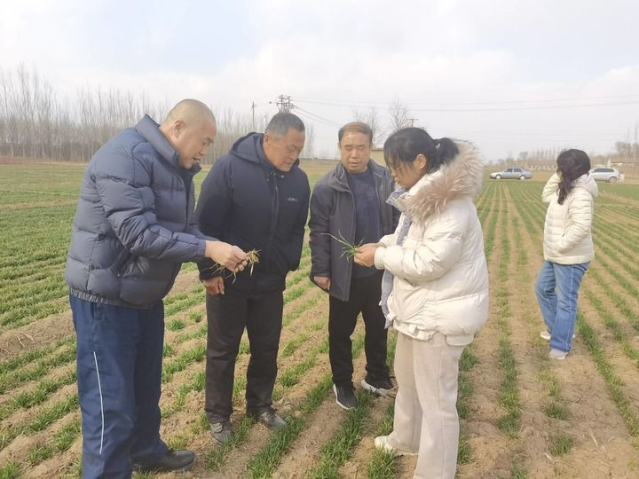 山東省夏津縣農(nóng)業(yè)農(nóng)村局植物保護(hù)站站長(zhǎng)、高級(jí)農(nóng)藝師鄭曰英(右二)正在開(kāi)展小麥苗情調(diào)查、病蟲(chóng)害監(jiān)測(cè),并指導(dǎo)糧農(nóng)加強(qiáng)春季田管。