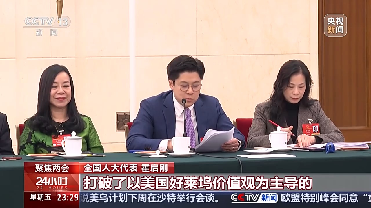 全國人大代表 霍啟剛:最近的《哪吒2》更創(chuàng)下票房歷史,打破了以美國好萊塢價值觀為主導(dǎo)的這種說故事的方式,成功以我們中國的故事和中國的哲學(xué)感染世界的觀眾。我認(rèn)為香港可以更加用文化+的概念跟理念,在文化產(chǎn)業(yè)發(fā)展上作出更多的貢獻(xiàn),更以香港國際橋梁和傳統(tǒng)優(yōu)勢,實現(xiàn)中國文化抱團(tuán)出海等,讓文化事業(yè)和文化產(chǎn)業(yè)得以相輔相成,把香港發(fā)揮成中華文化產(chǎn)業(yè)中的“金融港”和“出口港”。