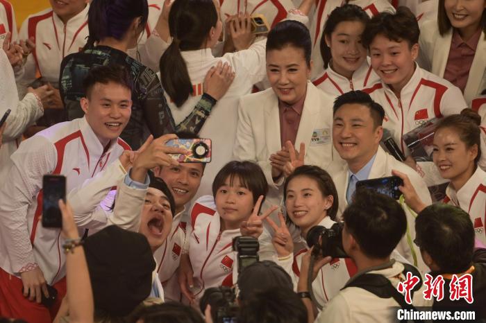 2024年8月30日,訪港的中國(guó)內(nèi)地奧運(yùn)健兒出席奧運(yùn)健兒大匯演。圖為香港藝人與奧運(yùn)健兒自拍。 中新社記者 陳永諾 攝