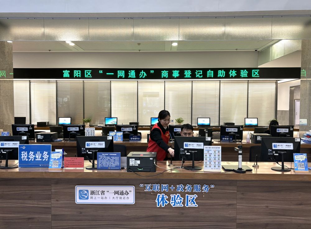 2月18日,在杭州市富陽區(qū)政務服務中心,工作人員引導群眾自助辦理“一網(wǎng)通辦”事項。(受訪單位供圖)