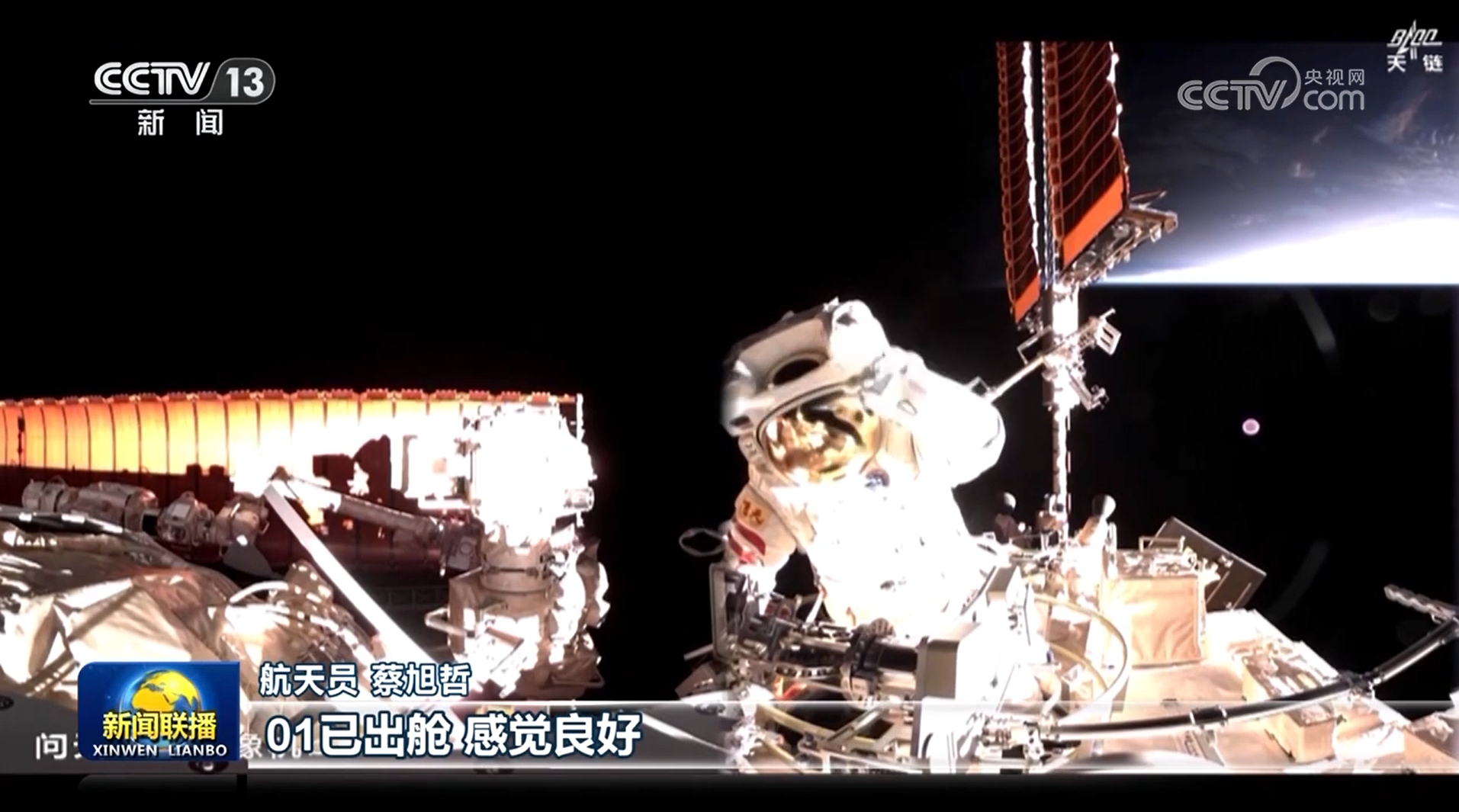 13時45分,航天員蔡旭哲打開出艙艙門,首先出艙。