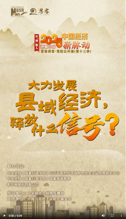 新一季“思客講堂·黨校公開課”《理響中國·以理服人|2025中國經(jīng)濟(jì)新脈動(dòng)》,帶你讀懂2025年經(jīng)濟(jì)工作重點(diǎn)?!扒|大縣”不斷擴(kuò)容,縣域消費(fèi)“多點(diǎn)開花”,“縣域”二字越來越火,成為經(jīng)濟(jì)發(fā)展的關(guān)鍵詞。2025年政府工作報(bào)告和2024年中央經(jīng)濟(jì)工作會(huì)議都強(qiáng)調(diào)要大力發(fā)展縣域經(jīng)濟(jì),這釋放了什么信號(hào)?中央黨校(國家行政學(xué)院)社會(huì)和生態(tài)文明教研部教授王曉莉?qū)Υ诉M(jìn)行解讀。