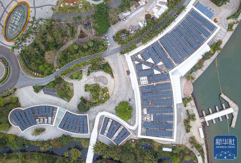 ↑ 這是在博鰲零碳示范區(qū)拍攝的博鰲亞洲論壇新聞中心及配樓屋頂?shù)墓夥O(shè)備(無人機照片,3月16日攝)。
