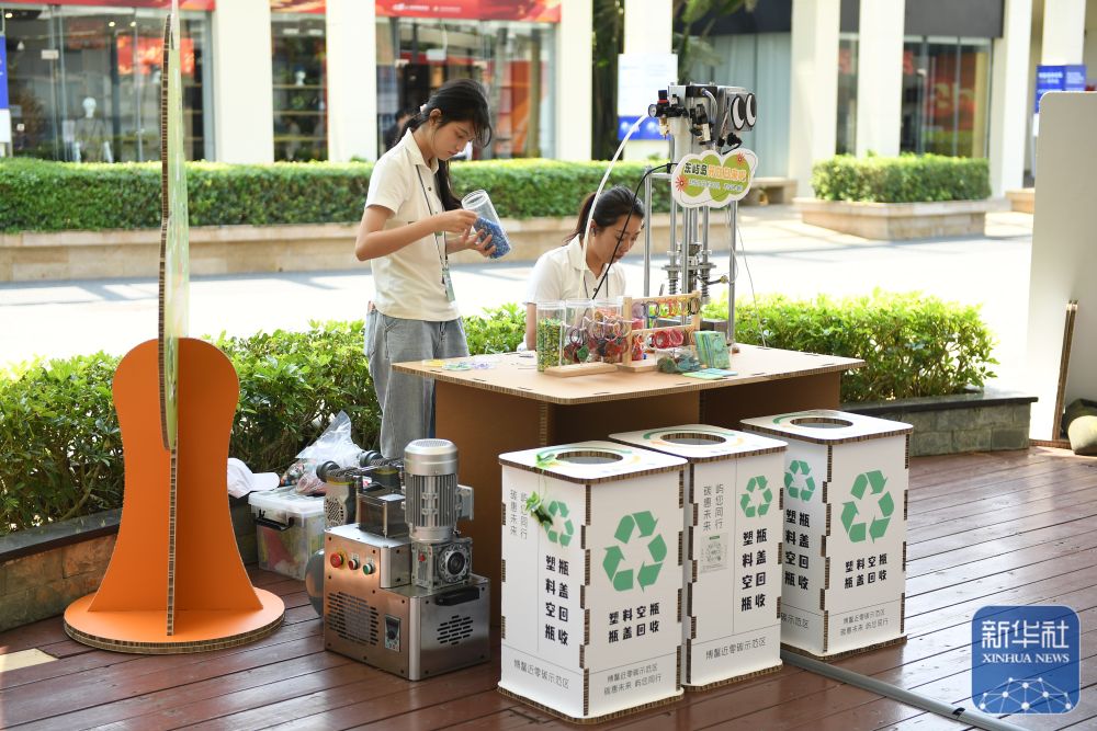 ↑ 這是在博鰲零碳示范區(qū)內(nèi)的塑料再生流程科普展臺上,工作人員演示塑料再生流程(3月25日攝)。