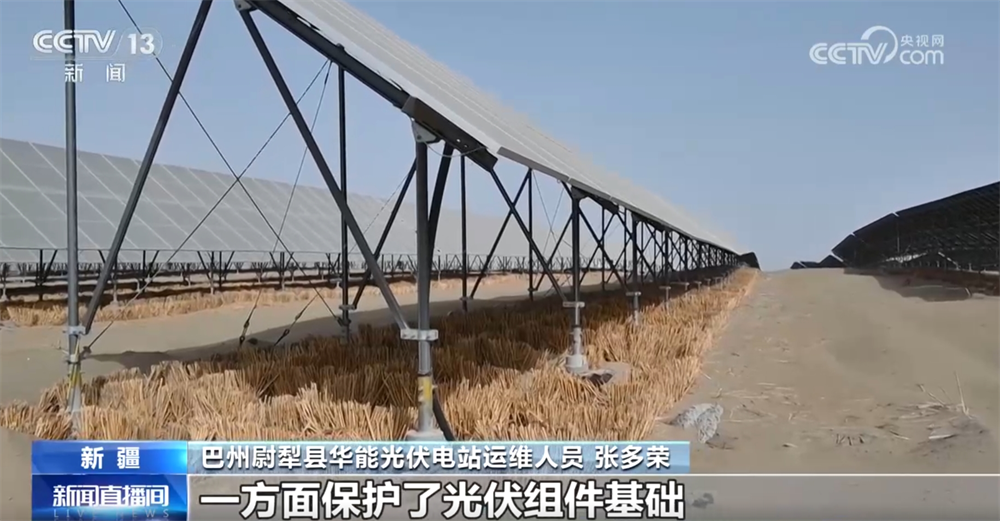 巴州尉犁縣華能光伏電站運維人員張多榮稱:“大概兩個月時間就能抽穗發(fā)芽了,一方面保護了光伏組件基礎不被黃沙掩埋或掏空,另一方面改善了周圍環(huán)境。”