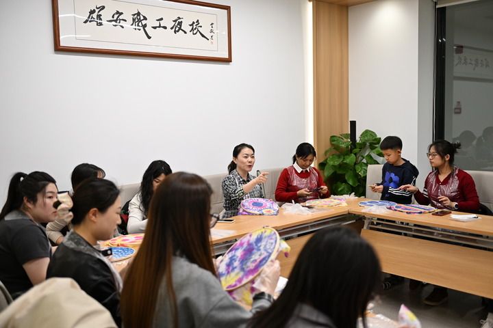 雄安新區(qū)職工夜校的學員在容東康寧雄觀書屋內(nèi)制作扎染(2025年3月14日攝)。新華社記者 牟宇 攝