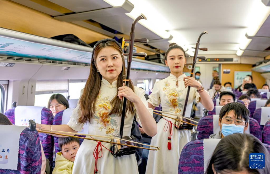 3月29日,揚州市文藝工作者在“水韻江蘇”主題旅游列車上進行二胡演奏。