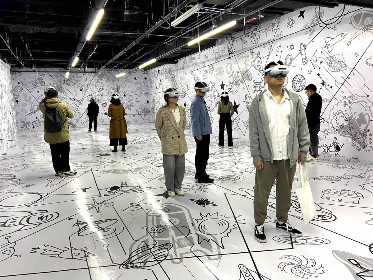 3月27日,在北京市石景山區(qū)首鋼園的沉浸式科幻空間展廳,參觀者戴上頭顯裝置,體驗(yàn)遙在(山東)數(shù)字科技有限公司打造的星際奇航旅程體驗(yàn)項(xiàng)目。(圖片來源:新華社)