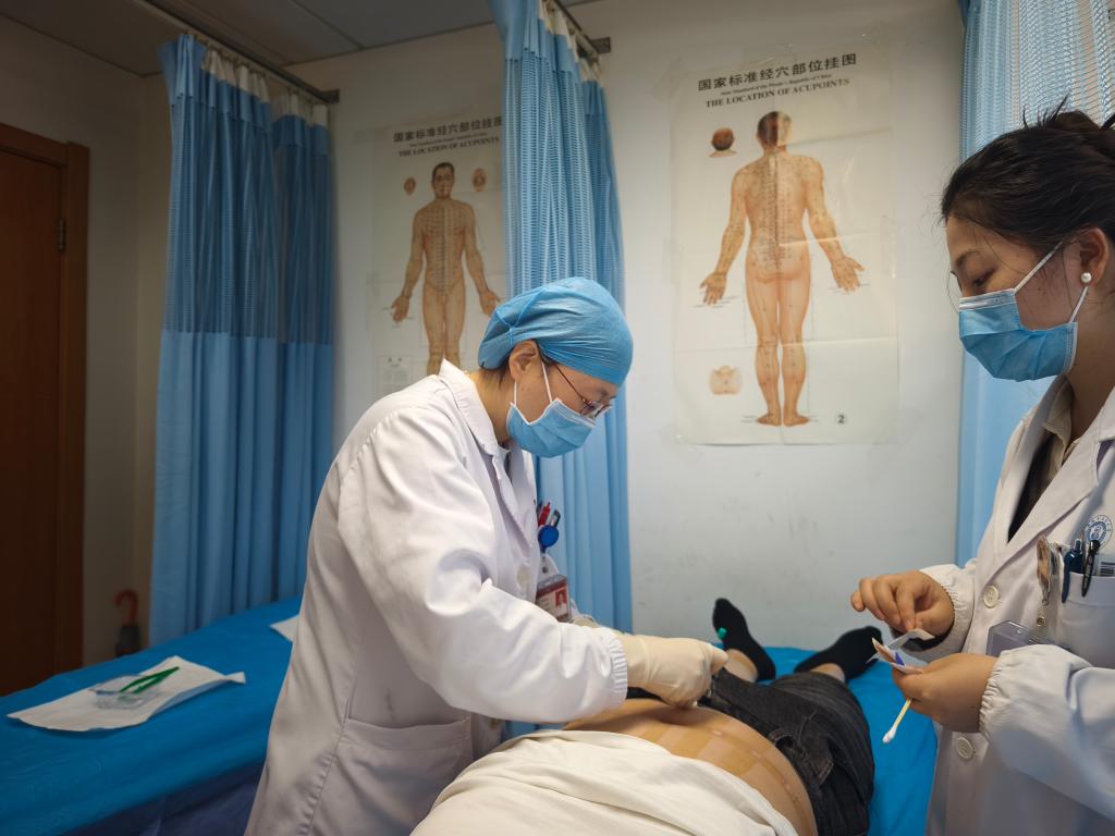 安徽省針灸醫(yī)院內(nèi)分泌科主任醫(yī)師費(fèi)愛華(左)為一位肥胖者開展埋線治療(4月7日攝)。新華社記者 郭晨 攝