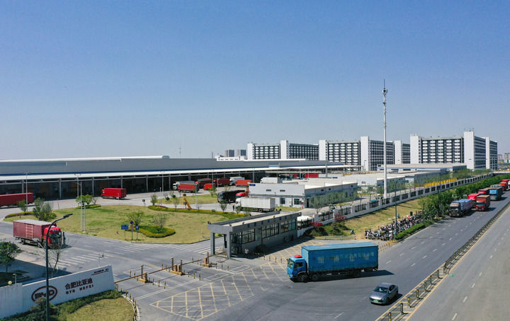 春風(fēng)和煦,楊柳輕舞,從合肥市區(qū)驅(qū)車向北約35公里,行至長豐縣中南部的下塘鎮(zhèn),以比亞迪命名的主干道上,運(yùn)送汽車零部件的貨車排成長長一列,魚貫而入比亞迪合肥基地園區(qū)。